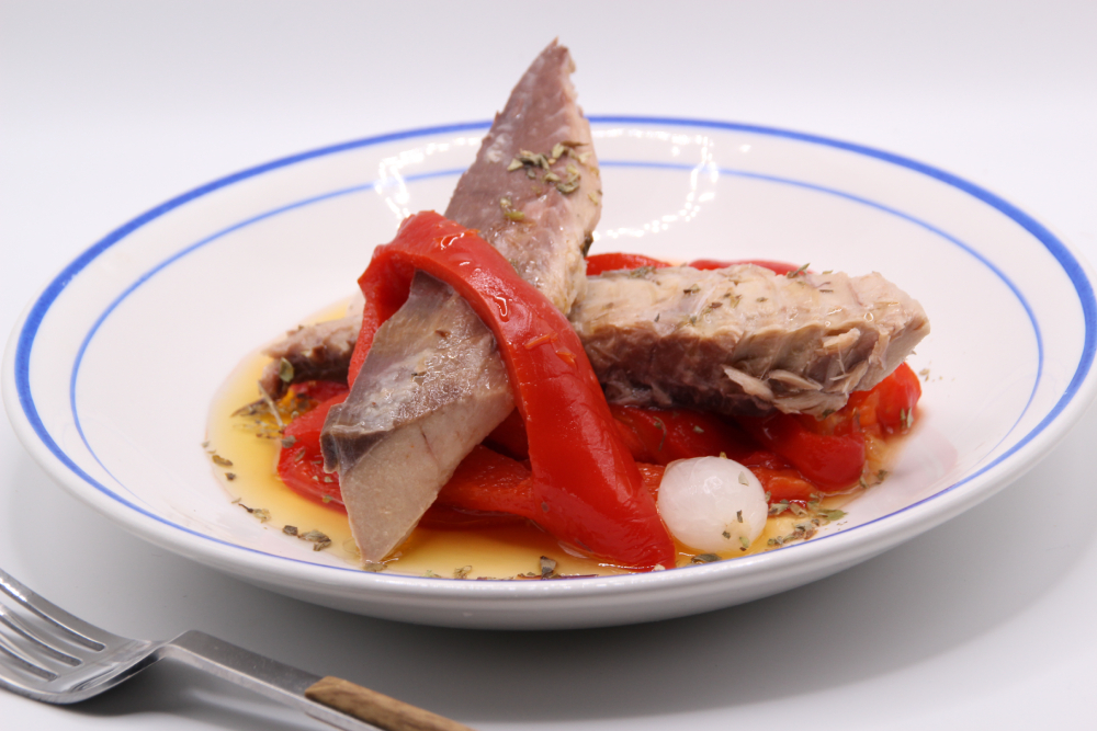 Por último, pelar los pimientos, cortándolos en tiras. Colocar encima los lomos de bonito y aderezar con la vinagreta. |