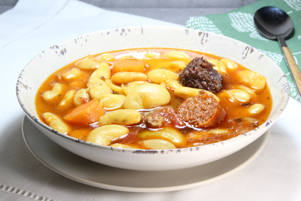 Para finalizar, introducir y pesar los 600 gr de judiones junto con la morcilla cortada en rodajas gruesas. Cerrar la tapa y cocinar en 4 minutos a 100º, velocidad 1. |