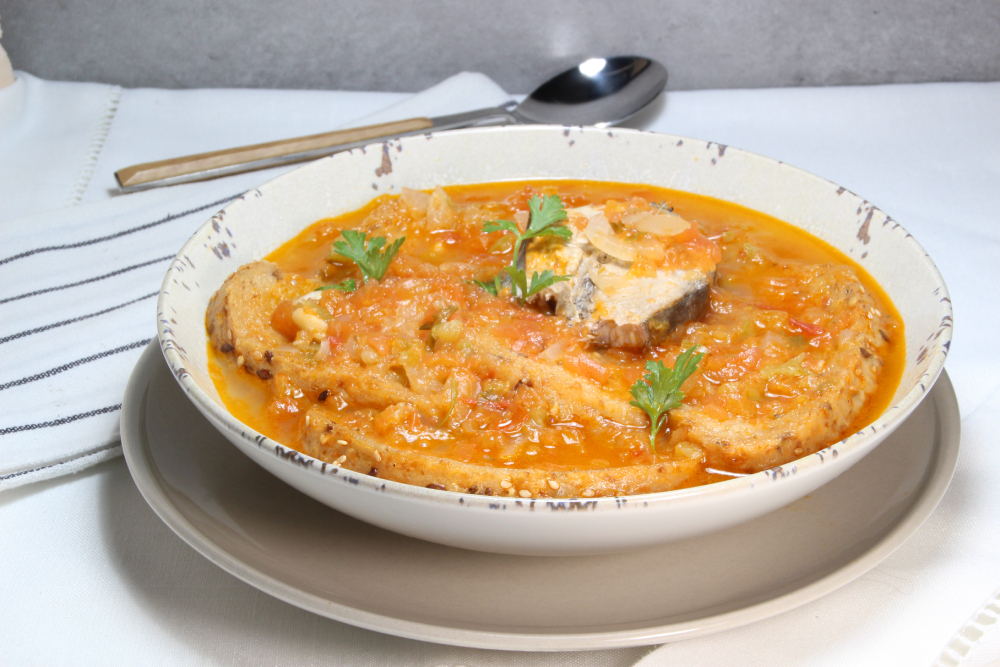 Ir colocando 1 o 2 rebanadas según el tamaño en cada uno de los platos de los comensales. Repartir igualmente el pescado y para finalizar verter el caldo de la sopa. Servir con perejil picado.